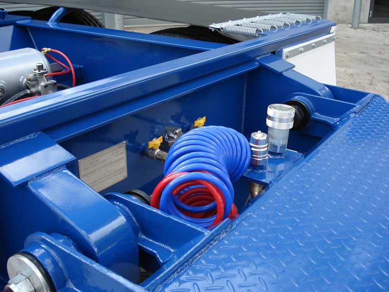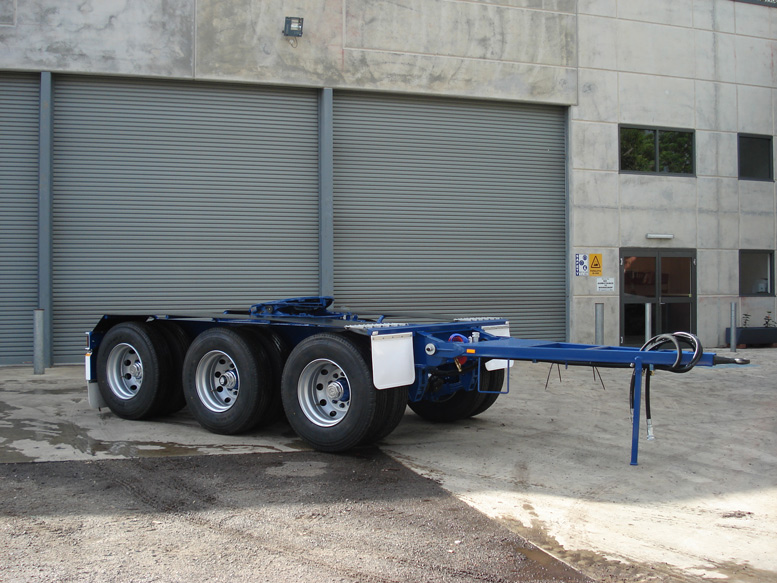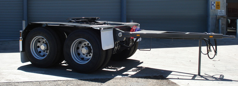 Constructed using 350 grade steel, our Dollies are all fabricated from I beam sections. Drawbars are made with RHS and have tread plate area with step. Rubber flexi guards to axle group, with full width mudflaps at the rear. Multi volt LED lights all round with yard release button.